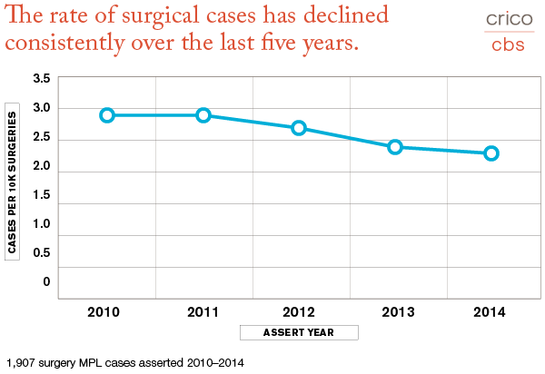 For example, while we observe that surgery-related events constitute the most common type of malpractice case (2010–2014), measuring those 7,273 cases against the total number of surgeries performed offers an alternate perspective, cases per 10,000 surgeries, which indicates a recent downward trend.